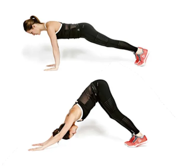 Z pozice vzporu, kdy máte zpevněný střed těla, se vytáhněte za patami a temenem hlavy. S nádechem se z dlaní odtáhněte za sedacími kostmi tak, abyste vytvořili ze svého těla střechu. Udržujte ramena i lopatky stažené směrem k hýždím a zároveň otevřené do šířky. S výdechem se brzdivým pohybem vracejte do pozice vzporu.