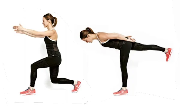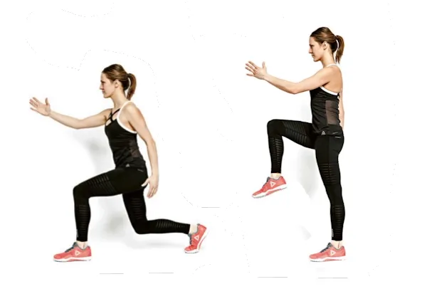 Zakročte levou nohou dozadu, přední koleno nepřesahuje přes špičku chodidla (ideálně ho držte nad kotníkem, pozor na koleno vbočené dovnitř). Pravá ruka je vpředu a levá vzadu. Poté s výdechem vyneste levou nohu před sebe a vystřídejte ruce. Vytáhněte se ze stojné nohy za temenem hlavy. A opět do výpadu. Pohyb je plynulý.