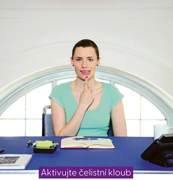 Položte si prst na bradu. Ústa nechte mírně pootevřená a uvolněná. Pohybujte čelistí ze strany na stranu. Totéž zkuste i se zavřenými ústy. Opakujte vždy, když zatínáte zuby nebo máte ztuhlou čelist.