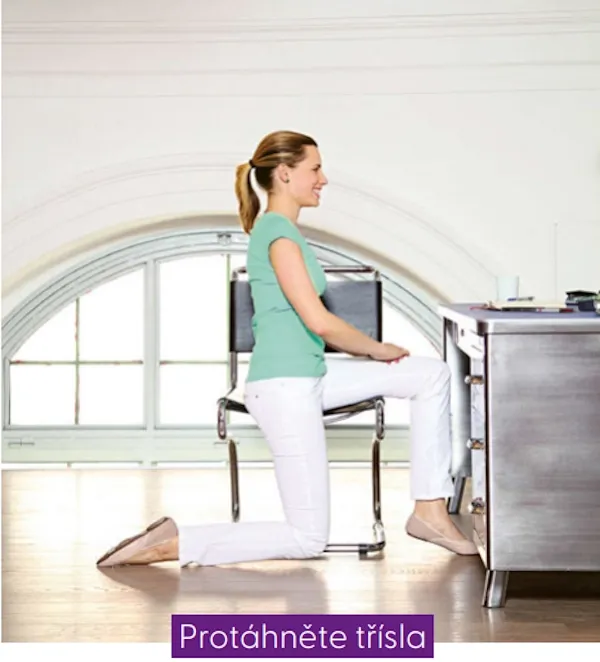 Posaďte se ze strany na okraj pracovní židle tak, že dáte levé stehno na šířku sedačky a koleno ohnete přes okraj židle. Pravou nohu spusťte dolů tak, abyste cítili protažení třísla. Tělo by mělo tvořit pravé úhly jak v tříslech, tak v kolenou. Spodní noha se může opírat o špičku, v případě nižší židle o nárt. Prodýchejte 5x a vyměňte strany.