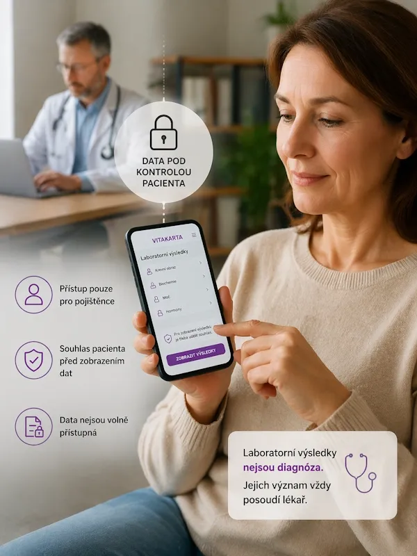 Vedle rychlosti a komfortu hraje roli také bezpečnost. Jak upozorňuje MUDr. Vojtová: „K laboratorním výsledkům má přístup pouze pojištěnec, nikoli pojišťovna. Před zobrazením musí každý klient o náhled výsledků v aplikaci požádat stiskem příslušného tlačítka, teprve potom, na základě předem uděleného souhlasu, mu VITAKARTA data zobrazí.“