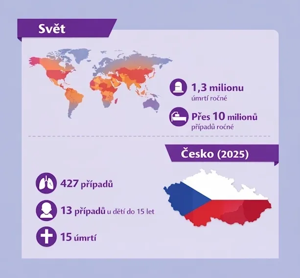 V Česku je její výskyt nízký, ale i u nás se tuberkulóza objevuje. V roce 2025 mělo podle Národního registru TBC tuto nemoc 427 lidí, z toho 13 případů bylo u dětí do 15 let. Na tuberkulózu zemřelo 15 lidí.