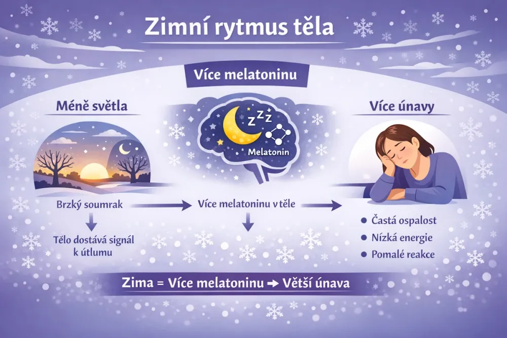 To přímo ovlivňuje produkci melatoninu – hormonu, který se tvoří ve tmě a navozuje ospalost. V zimě ho tělo produkuje více, proto se často cítíme unavení, zpomalení a méně výkonní.